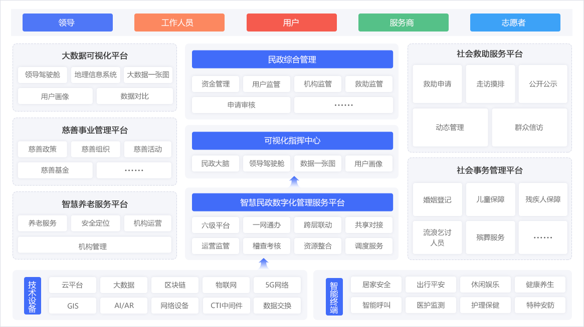 針對民政業(yè)務(wù)相對獨立,重復(fù)繁雜,信息資源無法共享等痛點,打造覆蓋民政基層“橫向到邊、縱向到底”全業(yè)務(wù)的應(yīng)用平臺,全面管理社會救助、社會事務(wù)、社會組織、防返貧、慈善事業(yè)、殯葬服務(wù)、政務(wù)辦公、優(yōu)撫安置等業(yè)務(wù)。根據(jù)各地不同特點定制開發(fā),實現(xiàn)省、市、縣(區(qū))、街道、社區(qū)五級貫穿,建設(shè)“業(yè)務(wù)縱橫統(tǒng)分、數(shù)據(jù)整合聯(lián)動、監(jiān)管實時比對、領(lǐng)導(dǎo)一圖全覽“的數(shù)字民政體系。