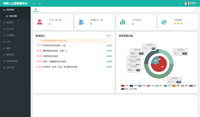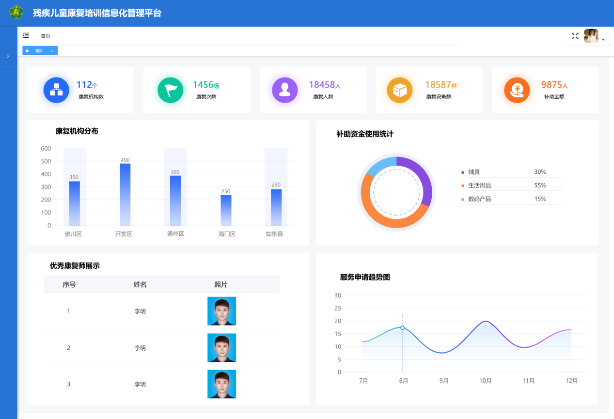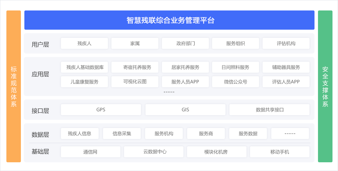 通過搭建“省-市-區(qū)(縣)-街道-社區(qū)”五級管理體系,建設殘疾人檔案、機構、輔具、康復、就業(yè)、慈善、無障礙等方面的綜合業(yè)務管理平臺,滿足主管部門的業(yè)務協(xié)同、數(shù)據(jù)交換、部門溝通等的扎口管理需求。借助“助殘服務直通車“,配套5大類助殘智能終端,提供輔具租賃、居家安防、居家探訪、兒童康復等助殘服務,實現(xiàn)殘聯(lián)工作統(tǒng)籌整合、有序管理,提高基層人員工作效率,提升殘疾人幸福感。